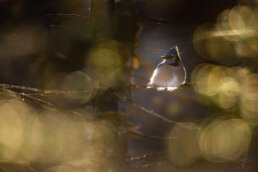 In a world of frost and sun-swirl, a lone blue jay waited, glowing like it had found the only warm idea in February. I stitched the scene wide to hold not just the bird, but the spectacle of swirling bokeh balls of winter sunlight.