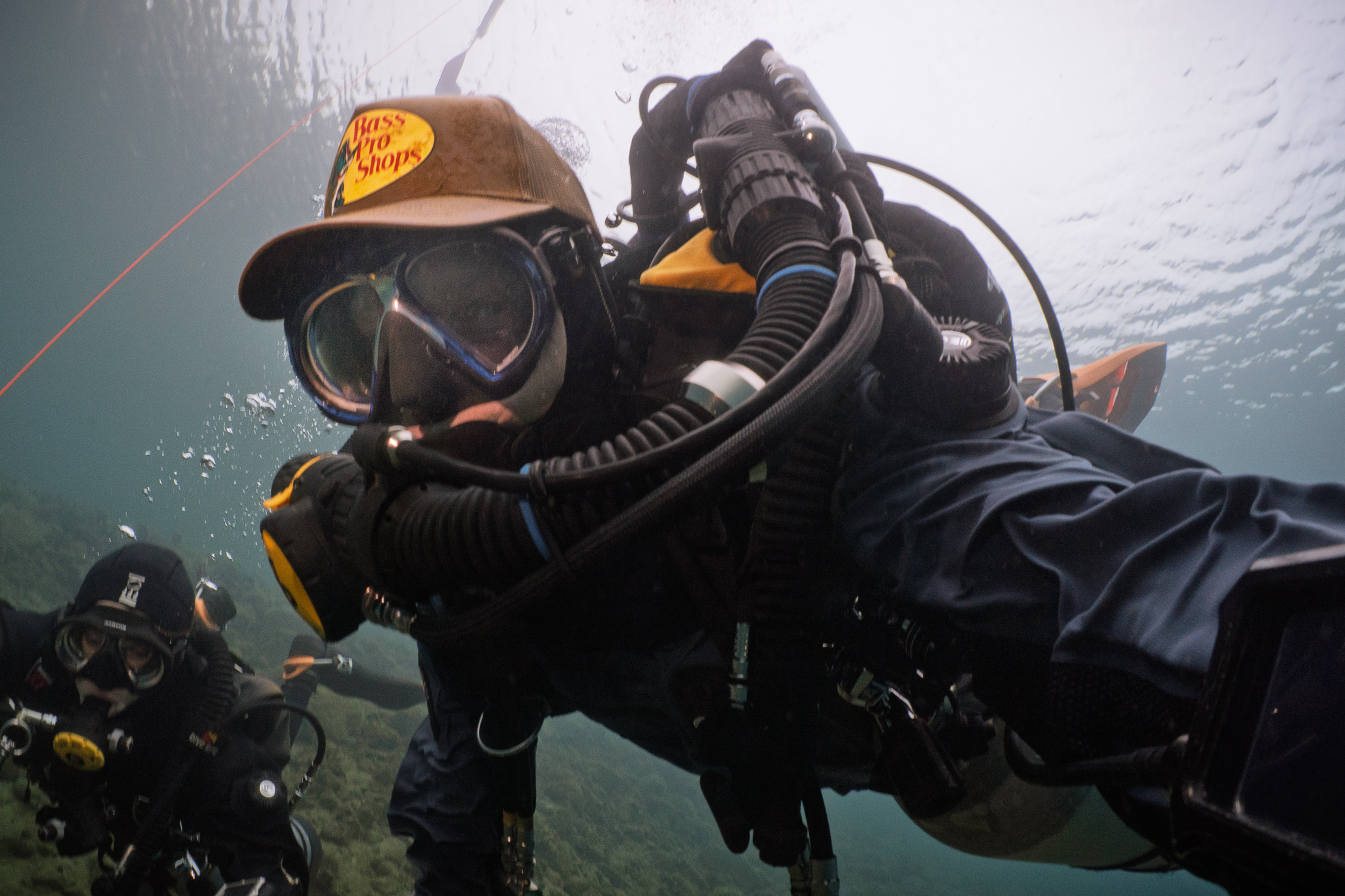 A few days later, Heather and I headed inland to St. James Pit in Aurora. The pits up there are former iron mines—deep, sheer-walled bowls filled with startlingly clear water, the color of old glass bottles. I’d gone hoping to get some video along the wall. The water was calm and visibility spectacular. The dive itself was meditative: slow fin strokes along the vertical rock, bubbles drifting up past rusty ledges and tree trunks that have been underwater for decades. I didn’t get any great footage, but I found a nearly new Bass Pro Shop hat at twenty feet—still had the cardboard insert behind the logo. You take your victories where you can find them.
