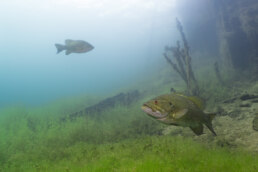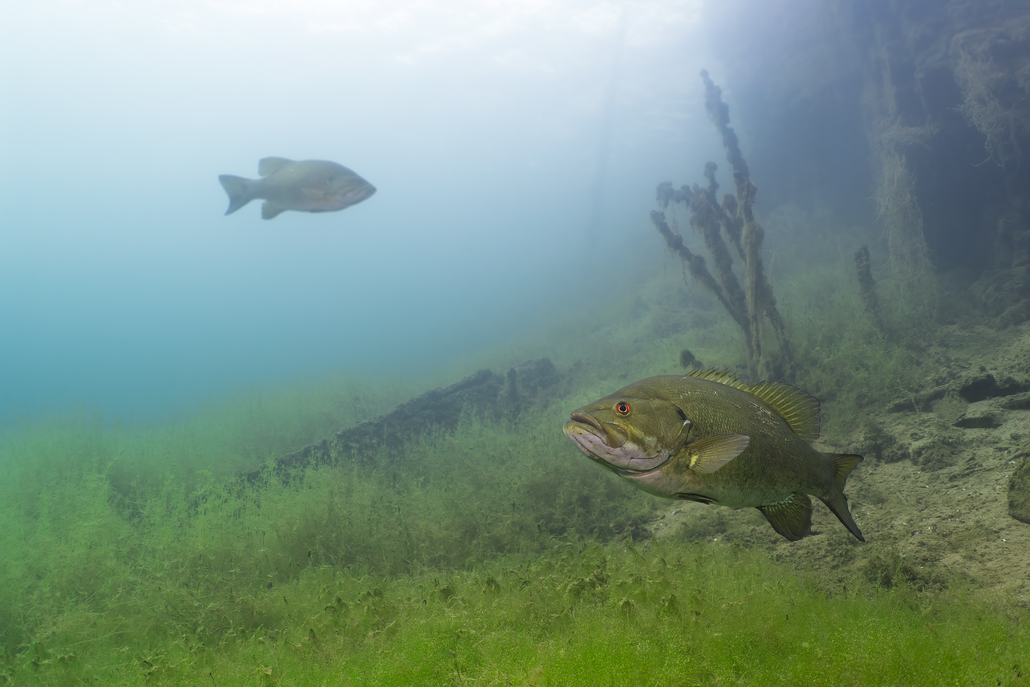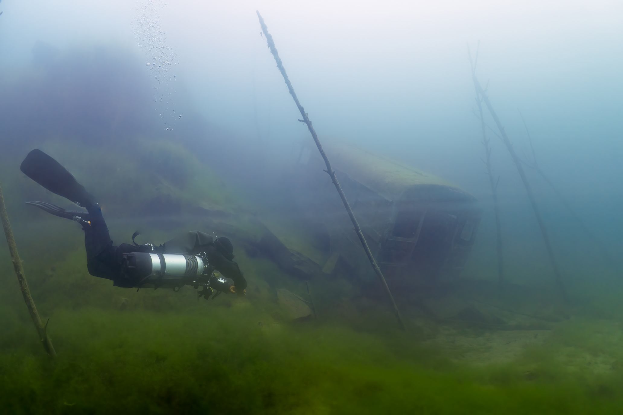 To finish the week, Heather and I made a quick trip up to Lake Ore-be-gone in Gilbert—one of those dives that feels less like exploration and more like a slow wander through a dream. We slipped in from the boat launch and drifted past the local landmarks—a sunken helicopter, a school bus—before meandering along low rock walls and through a submerged forest alive with bass and the occasional, suspicious-looking pike. Around thirty-five feet down, a soft, milky haze marked the thermocline—the invisible border where warm surface water gives way to the cold depths. Crossing it is like swimming through a ghost: the light shifts, your skin prickles, and for a moment the lake feels immense and ancient.
