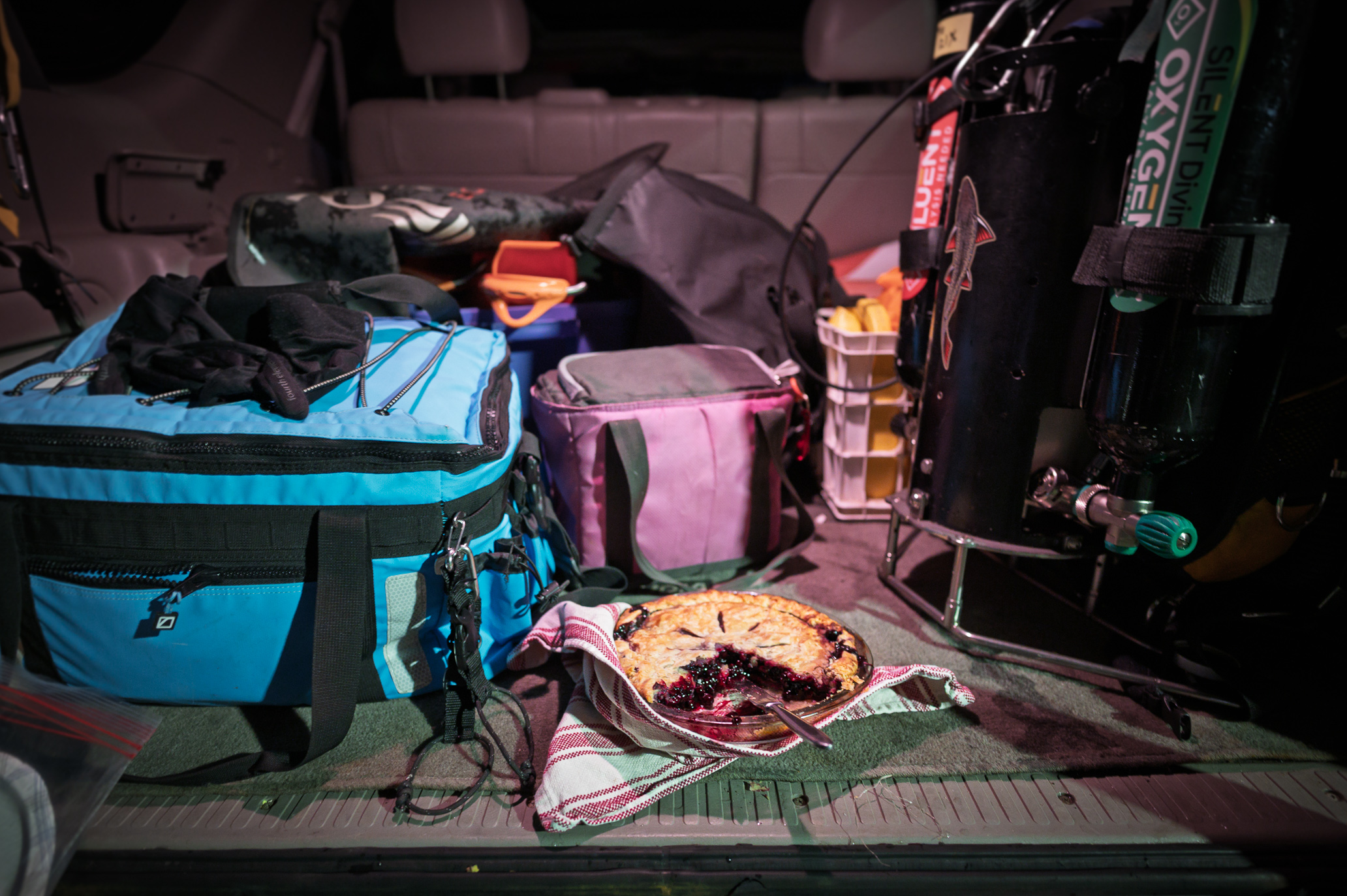 After the dive, Heather produced a blueberry pie, still warm, and we stood there on the shore sipping tea, shivering in the dark, and feeling rather pleased with ourselves. The lake was calm, the air brisk, and the pie perfect. You can’t ask for much more than that.