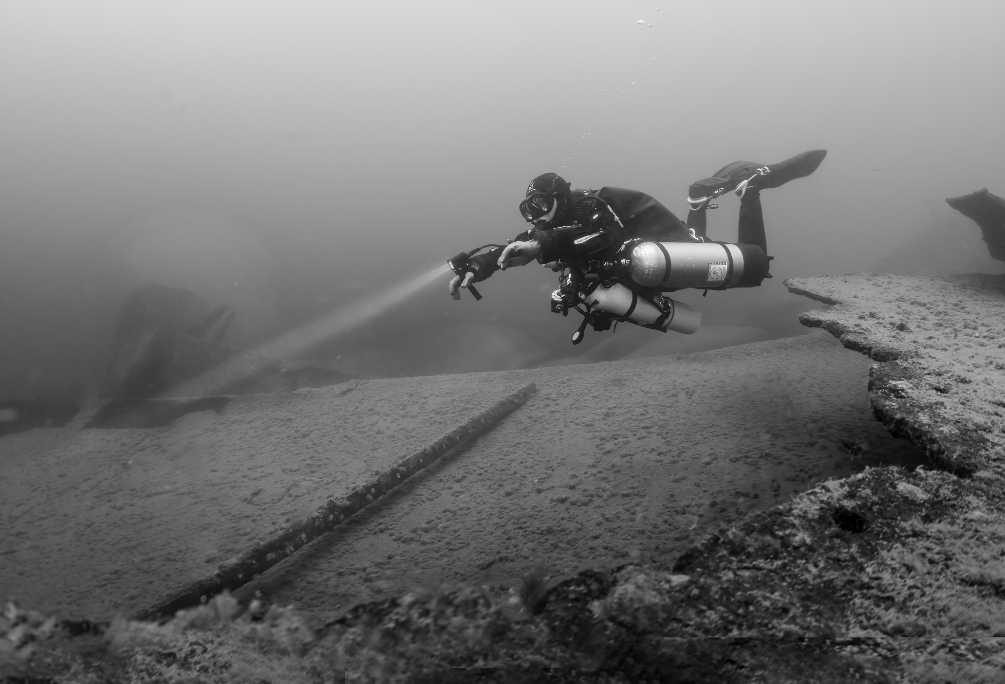 The descent was stopped moments after it started by a stray dog hair on my first stage diluent o-ring. On closer examination, the leak was minor enough that I decided not to return to shore and deal with it, and continue the dive closely monitoring my diluent pressures.  It took us maybe 20 minutes to descend to the hatch. I took a couple of photos with my strobes on, which looked “okay,” but then Heather illuminated it with her torch, and in the beam’s glow, it looked cinematic, almost holy. I switched off my strobes and took a few shots. The image that appeared on my viewfinder was exactly what I’d imagined—quiet, textured, and somehow complete. My deepest photo yet.
