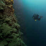 The dive itself started with a narrow descent—a slot in the rock that opened like an elevator shaft. Two minutes in, and we were brushing 100 feet. The wall to our left rose like a fortress, a vertical drop carved by men who probably never imagined two idiots would be finning along it a century later, pondering whether to go deeper.