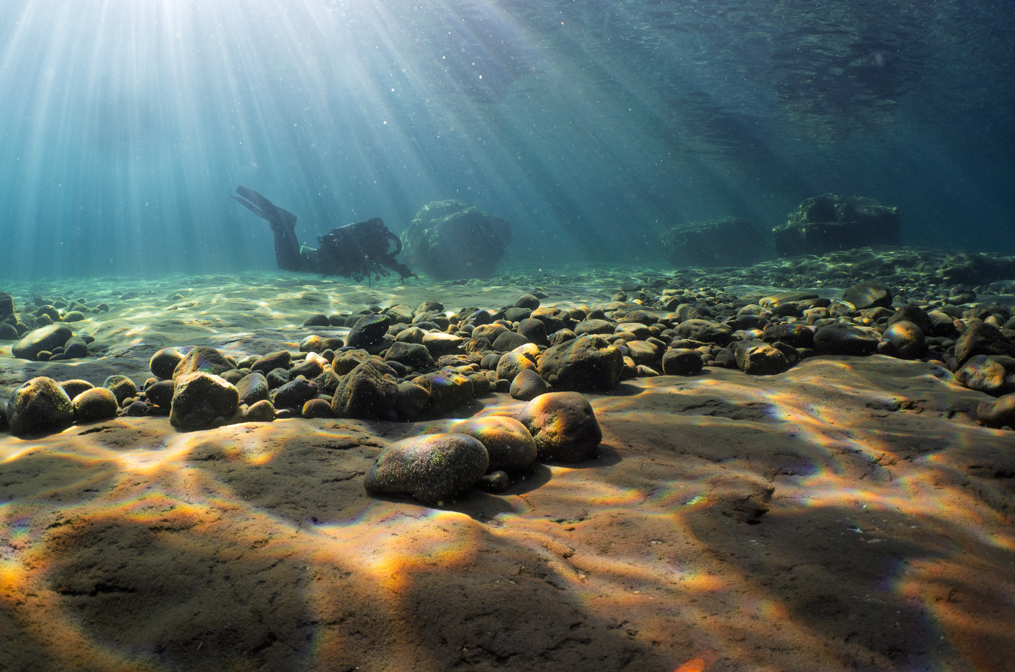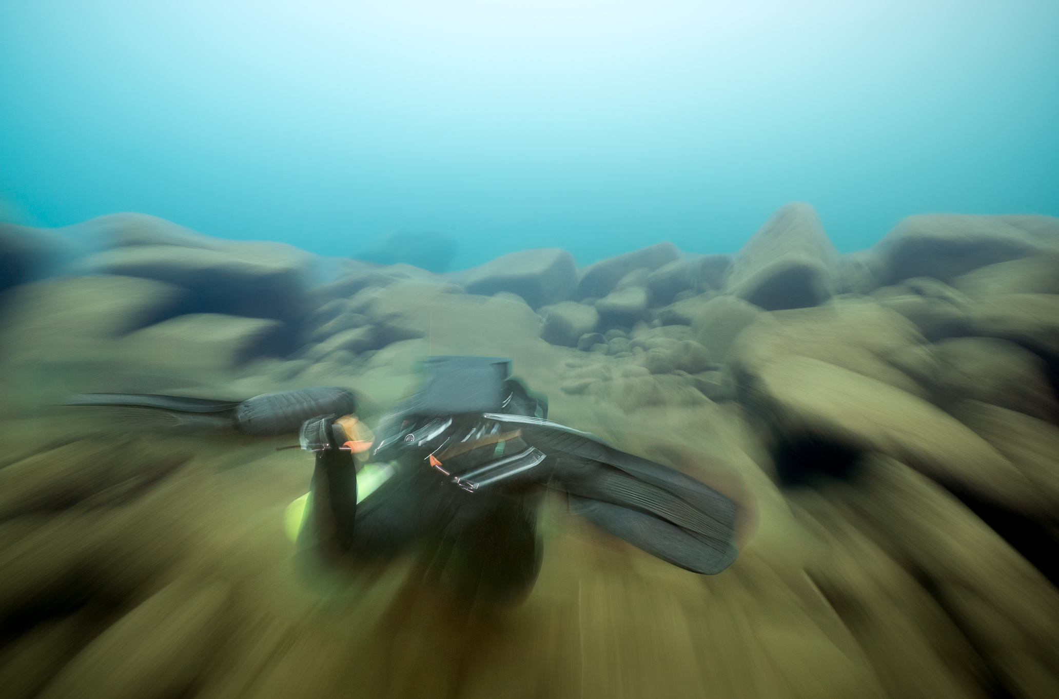 Our next dive was more relaxed — Gooseberry, in crisp, clear water, shafts of rainbow light dancing through the shallows. I always hope to spot sturgeon, given how many I’ve seen before, but not this time. Later in the week, the skies turned dour: gray drizzle, brisk air in the 30s. We dove from Brighton Beach instead of venturing further. Visibility was so-so, but I slowed my shutter speed and played with light, and motion.
