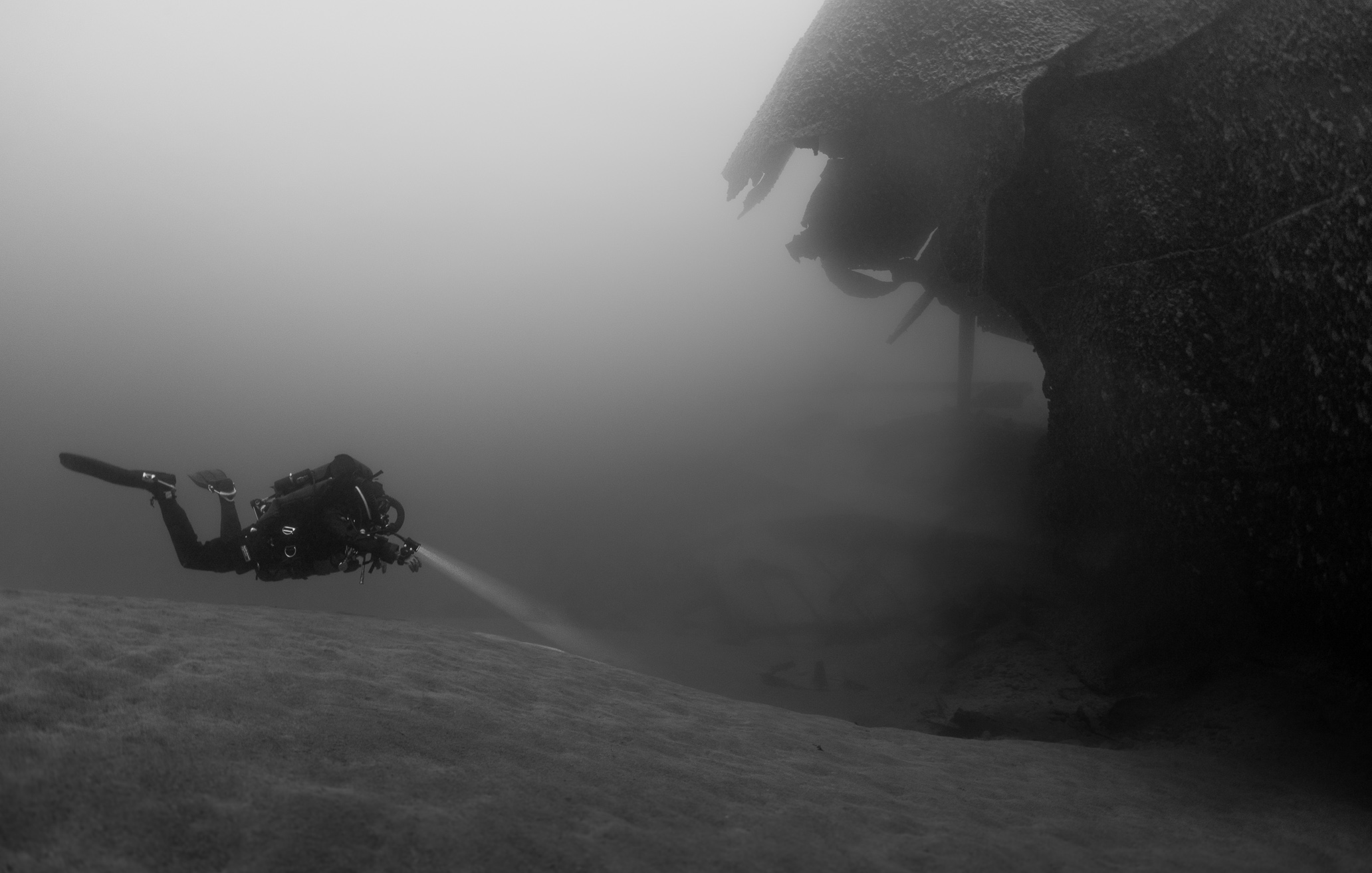 Heather’s beam slips across the tangled steel, a quiet handshake with a wreck that’s spent 120 Novembers in the cold. Down here, even the silence feels historical.
