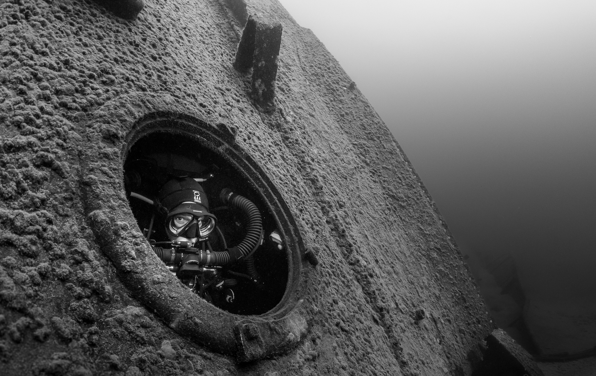 We deviated a little from our usual route, navigating toward what I now understand as the chain locker — the small compartment deep in the bow, where the anchor chain was stowed (sometimes called the “locker room” or “anchor locker” on old ships). On the Madeira, it’s reasonably accessible, even now in ruin, though the ship lies twisted across the lake bottom. Suspended just off the wreck, I watched Heather peer from the chain locker porthole, her face lit gently and set against the battered sweep of the Madeira’s steel.