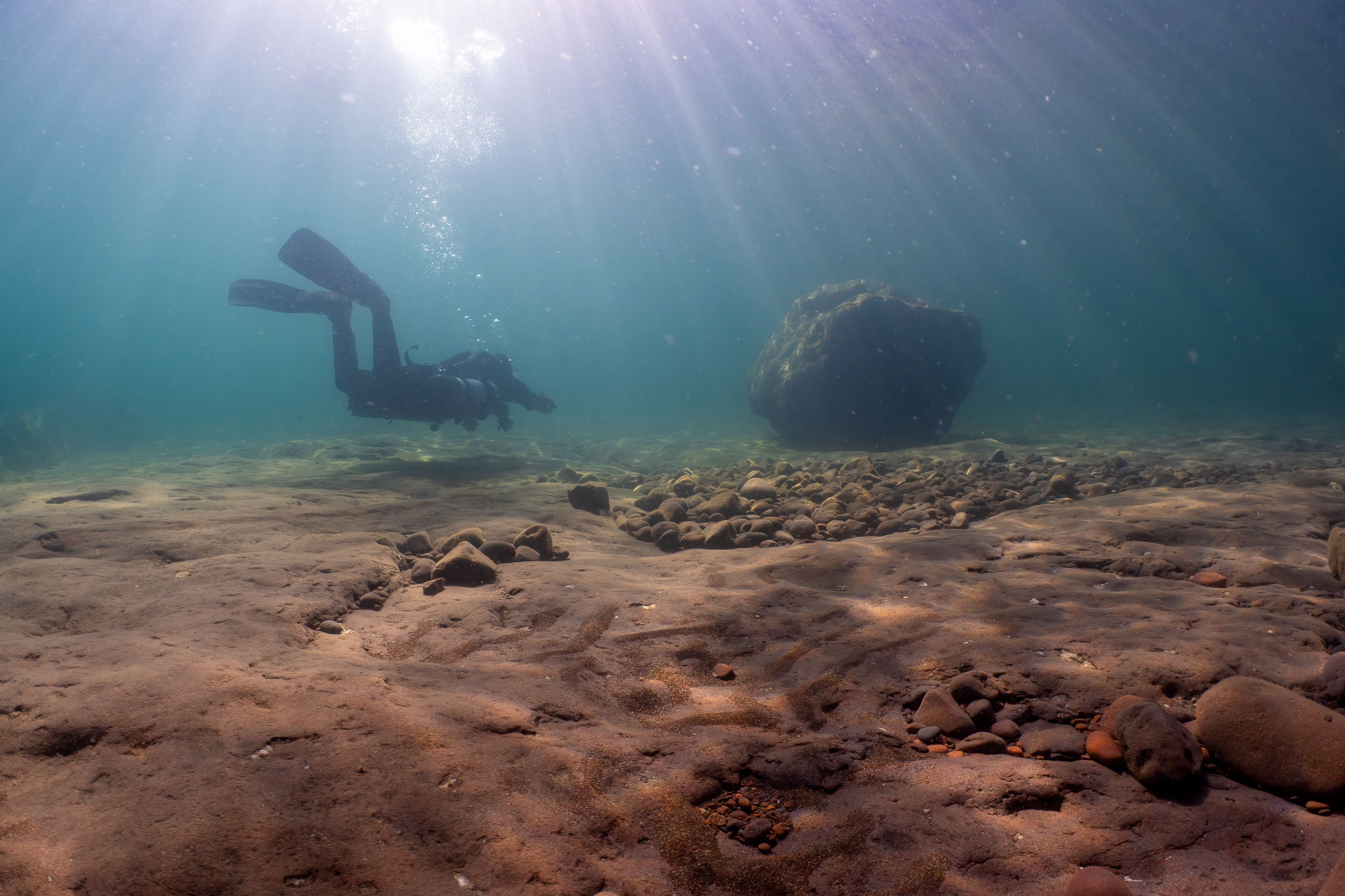 So we drove to Gooseberry Falls, kitted up, and dropped in where the rocky shore gives way to the gravel flats at 50 feet. We thought maybe—just maybe—we’d see another sturgeon. I’d seen one on my last two dives, and that already felt like absurd good luck. Most divers go their entire lives without catching so much as a shadow. But this time we saw four.