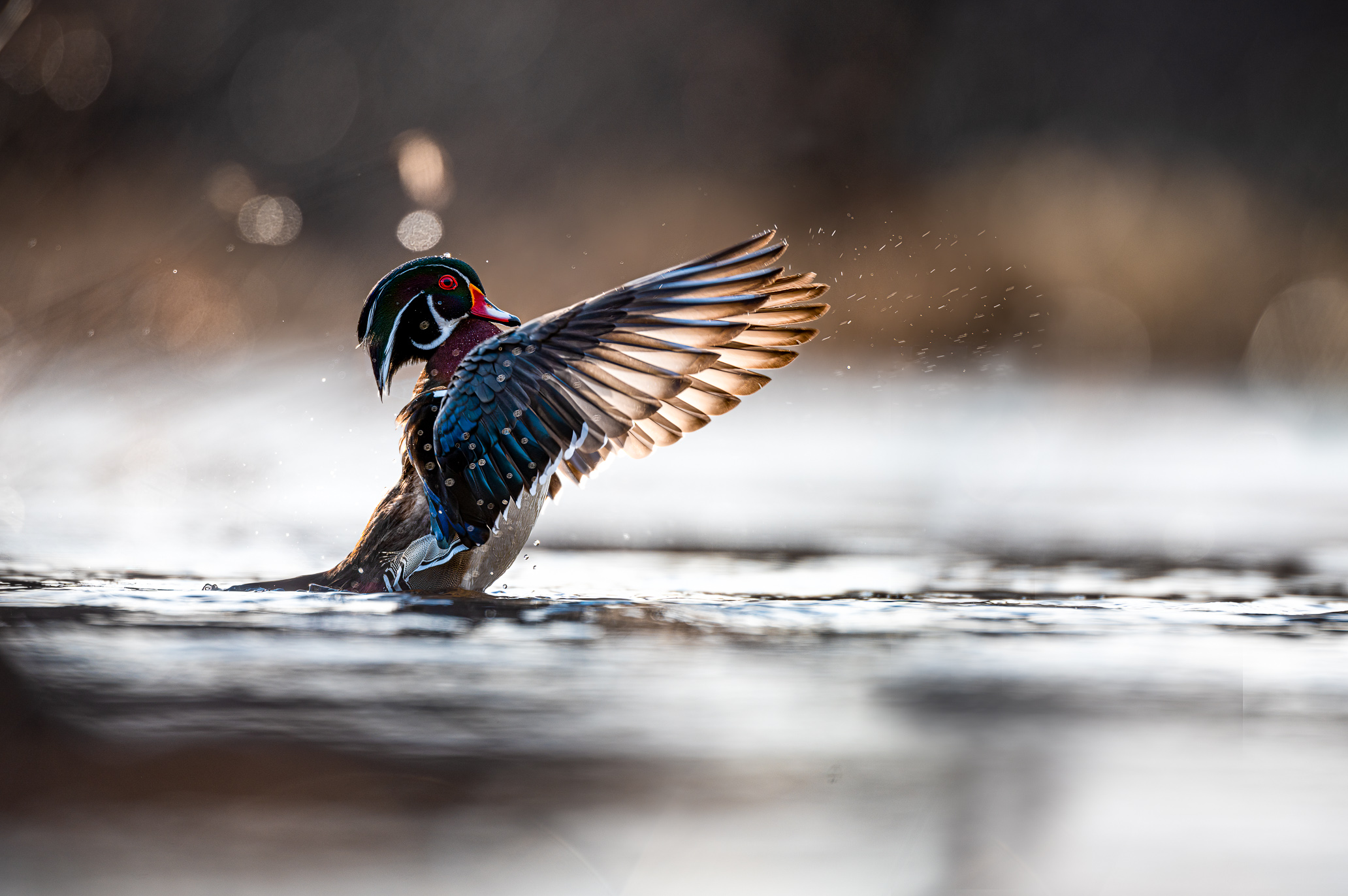 A wood duck, looking as if it dressed for the opera and forgot its ticket, flaps away the chill of a Minnesota morning—just down the street from home, where nature still performs for free.
