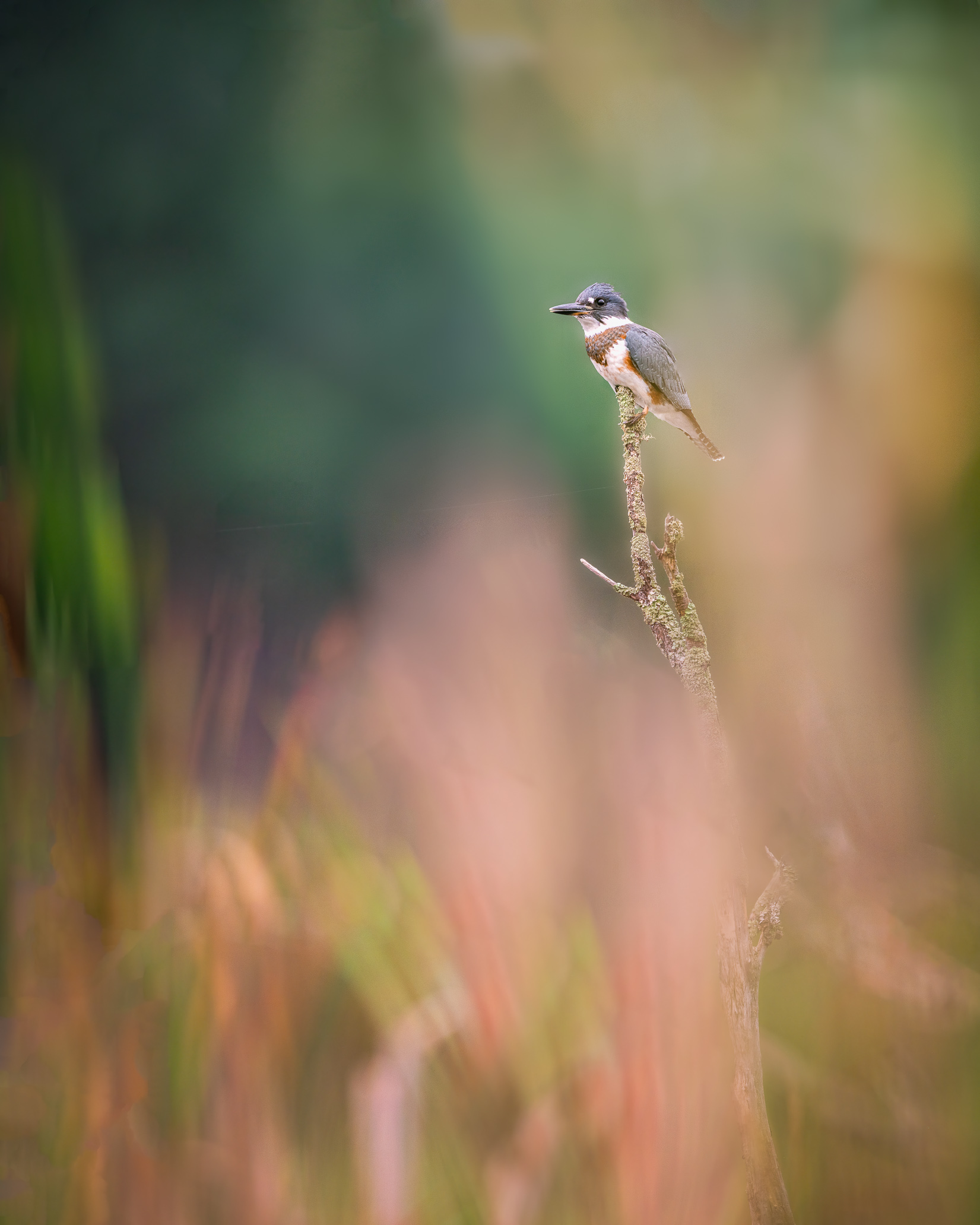 Belted Kingfishers don’t just have a favorite perch — they have an entire commute. They cycle through a handful of carefully chosen lookout posts scattered around the marsh, pausing at each like a seasoned angler checking old, reliable fishing holes before moving on to the next.