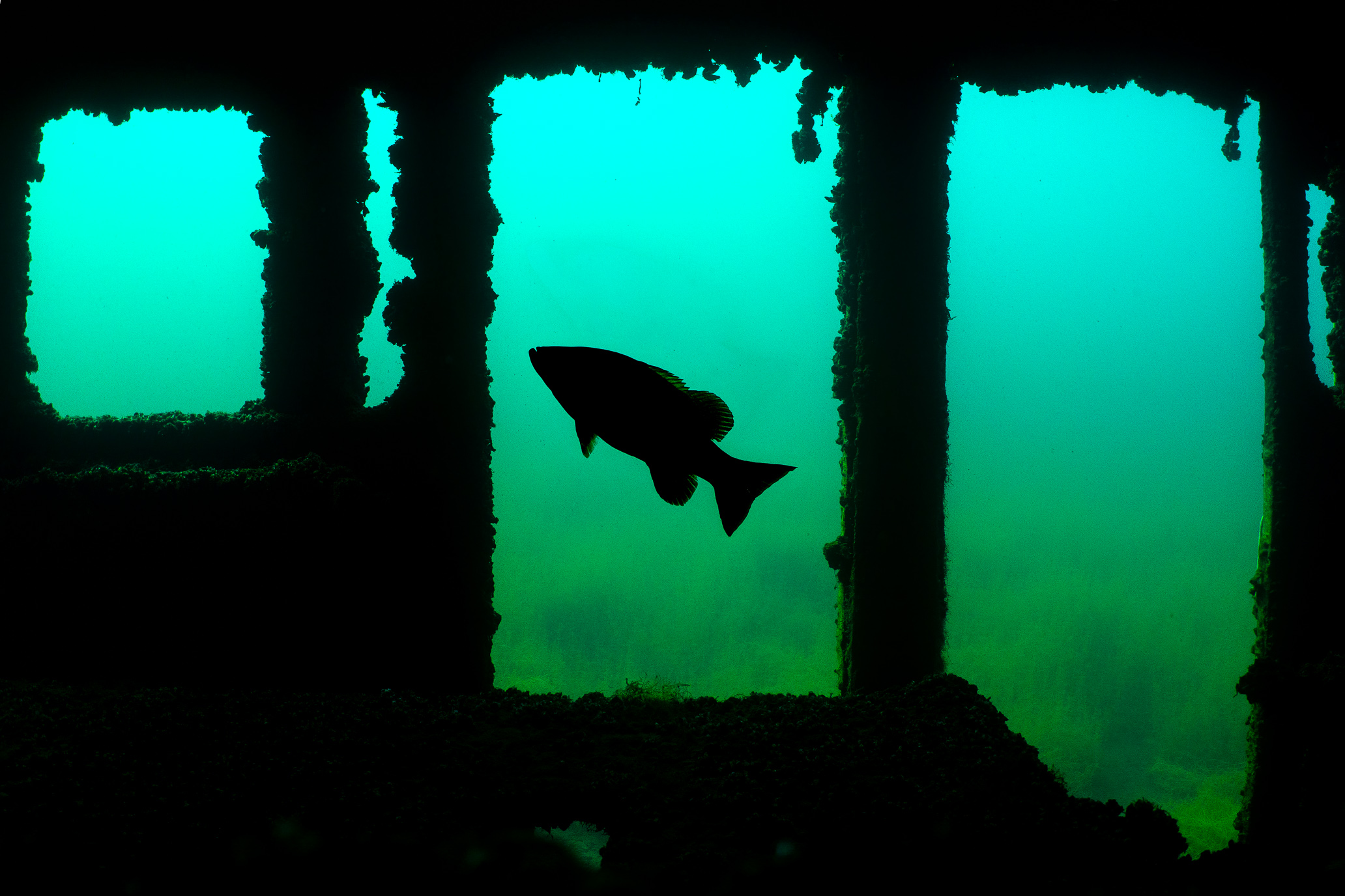 The ghost of a mining era frames a lone bass in the emerald depths: once a rail-speeder hauling men and iron, now a sunken window to underwater life.