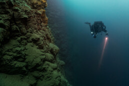 August 11, 2025Tioga wall At Tioga Pit the walls drop away like a forgotten canyon. Heather’s light disappears into the blue and I’m reminded how small a diver looks in a place that used to swallow machines whole. ←back to Gallery